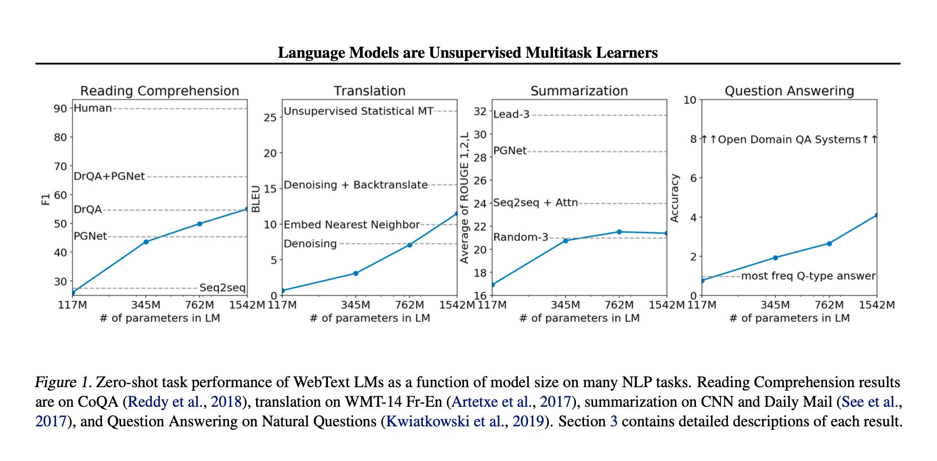 The results validated the hypothesis. 55 F1 on CoQA (reading comprehension) without seeing a single training example. 7 out of 8 benchmarks beaten in zero-shot mode. The blue line in every graph goes up as parameters increase.