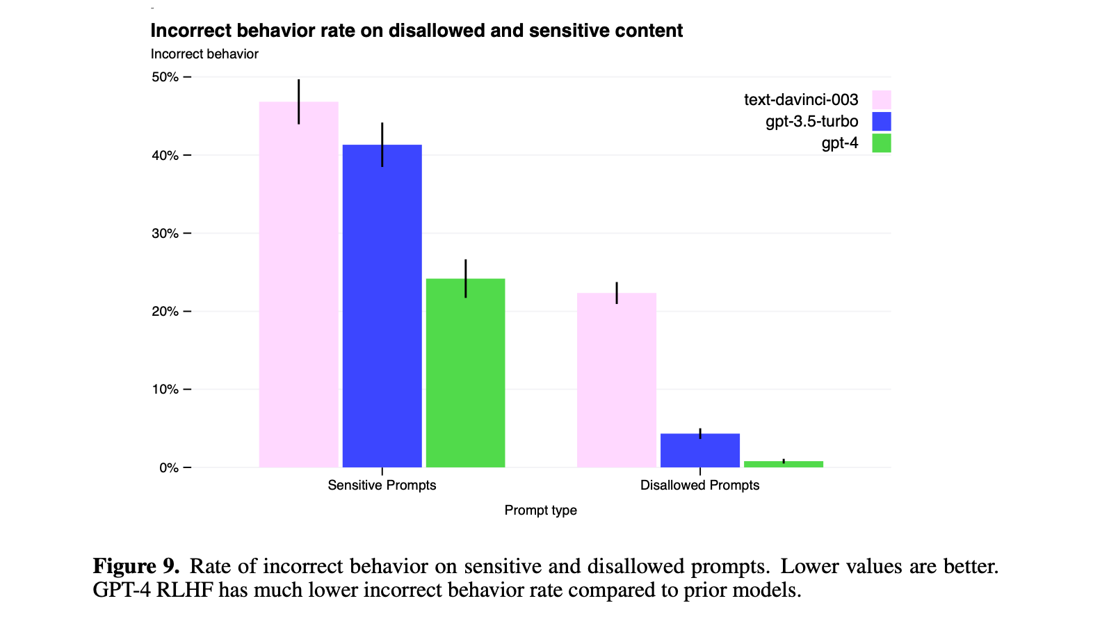 The incorrect behavior rate dropped dramatically from text-davinci-003 to GPT-4. Progress, but not perfection.