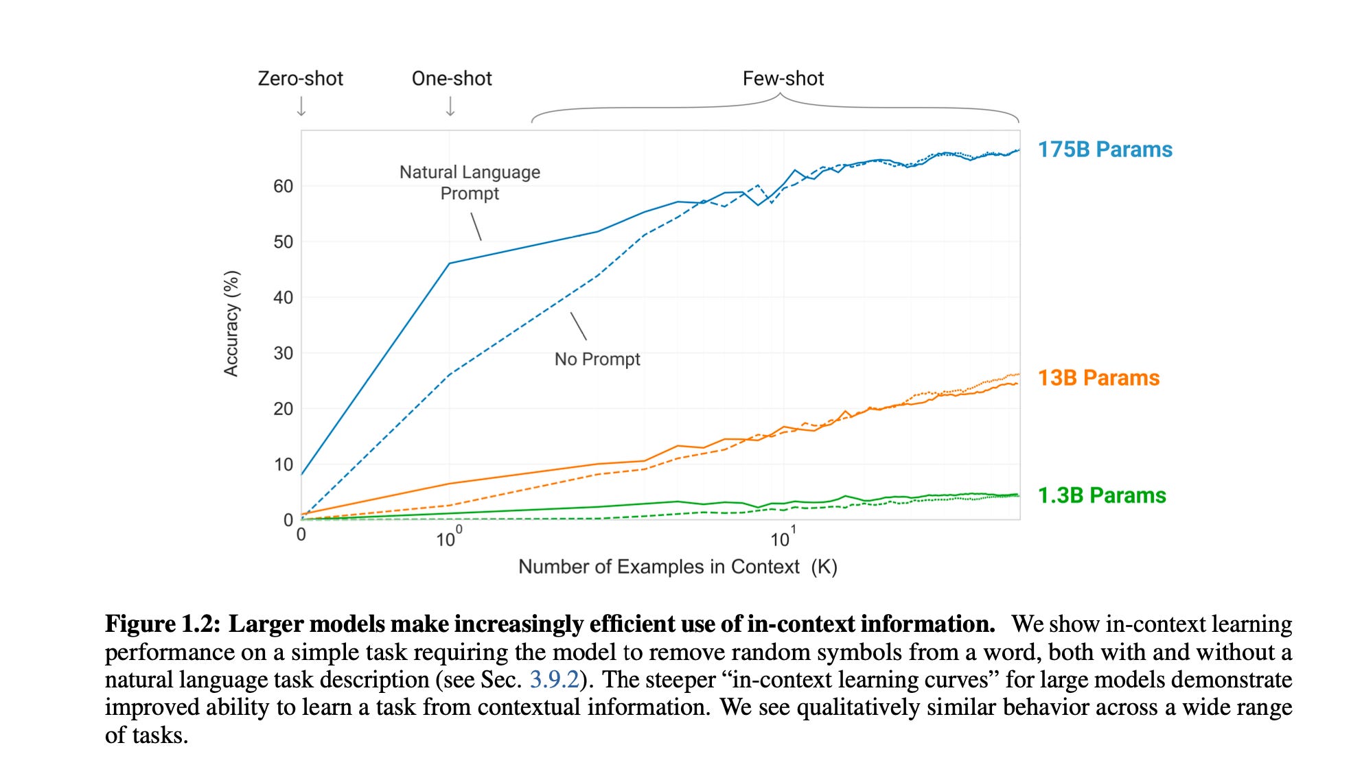 At 175B parameters (117x GPT-2), the model became dramatically more efficient at using context. The slope of the learning curve for the 175B model is steeper than the 13B model. Bigger models don’t just know more; they figure out what you want faster.